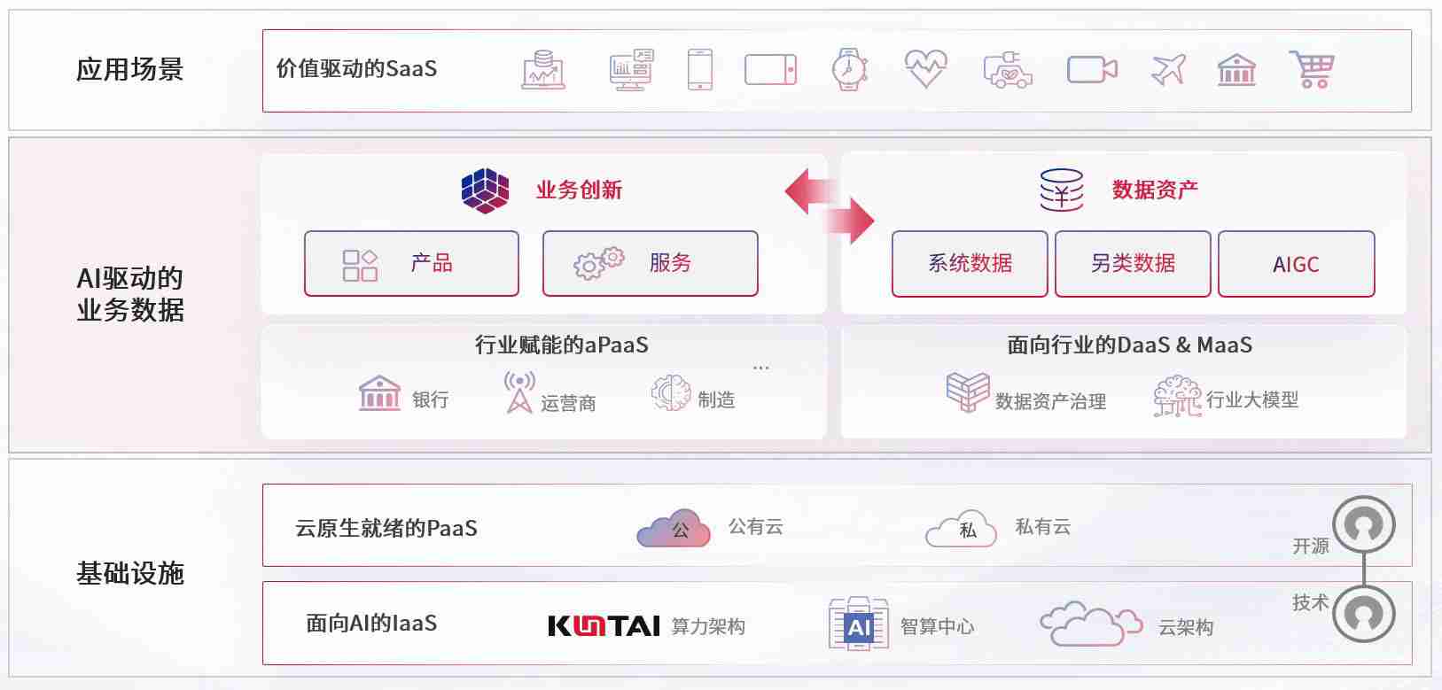 数字时代,,围绕企业数字化转型的关键要素,,,,AG尊龙数码开创性的提出数云融合战略和技术体系框架,,,,着力在云原生、、数字原生、、AI原生和信创产业上架构产品和服务能力,,为处在不同数字化转型阶段的快消零售、、汽车、、金融、、、、医疗、、、政企、、教育、、、运营商等行业客户提供泛在的敏捷IT能力和融合的数据驱动能力,,,,构建跨界融合创新的数字业务场景和新业务模式,,助力企业级客户建立面向未来的核心能力和竞争优势,,,,全面推动社会的数字化、、、智能化转型升级。。
